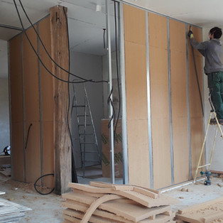 On utilise principalement du placo avec des panneaux de fibre de bois pour l'isolation phonique.